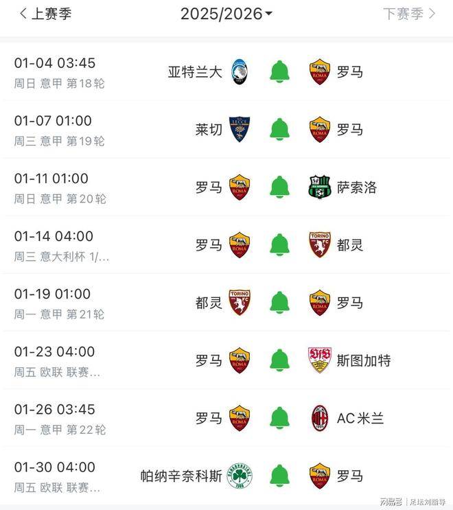 最让罗马球迷担心的是,罗马在整个一月的赛程异常密集,包含了意甲联赛、欧联杯和意大利杯的三线场比赛,几乎每隔三天就要打一场。1月4日,罗马将客场挑战亚特兰大,短短两天后,他们又将前往莱切进行客场比赛;接下来,三天后主场对阵萨索洛,接着又是三天后的意大利杯主场迎战都灵,四天后,意甲赛场依然要对阵都灵;然后是三天后主场迎战领头羊AC米兰,最后,三天后又要客场迎战欧联杯的帕纳辛纳科斯。可以说,整个一月,罗马将一直处于马不停蹄的赛程中,几乎没有任何喘息时间。