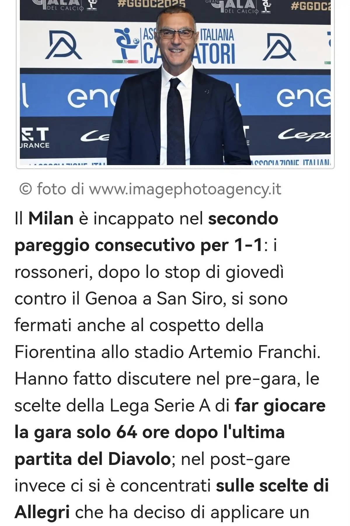 前国际米兰球员、评论员贝佩·贝尔戈米,就米兰在佛罗伦萨的表现发表评论:“制定赛程的人之后得给大家一个解释:先是安排米兰周五对阵卡利亚里,紧接着又要在周四出战热那亚。在我看来,阿莱格里在两场比赛中权衡了一番,认为对阵科莫的比赛要比这场对阵佛罗伦萨的较量更难踢。我猜他当时就是这么考虑的。不过话说回来,米兰在上半场其实有三次必进球的机会啊……”