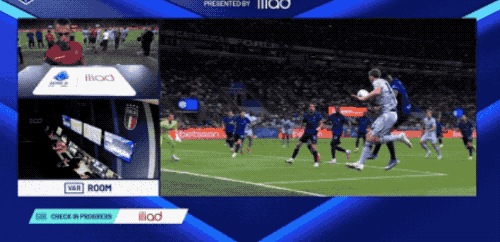 第26分钟,刚刚建功的邓弗里斯在本方禁区内不慎手球,VAR介入,裁判判罚点球。