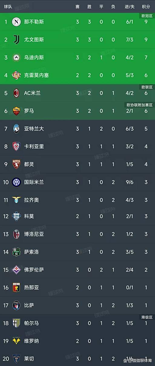 意甲直播,意甲赛程,意甲积分榜,尤文图斯直播,意甲比分预测/面向中文球迷的意甲资讯平台,涵盖2025赛季完整赛程、免费高清直播入口、积分榜更新与竞彩波胆预测,聚焦尤文、国米、米兰三大豪门赛事。北京时间9月15日,意甲联赛第三轮战火纷飞,八场鏖战过后,积分榜形势再度洗牌。尤文图斯和那不勒斯两支劲旅表现抢眼,均以三连胜的完美姿态,斩获满分九分,高居积分榜前列,领跑群雄。