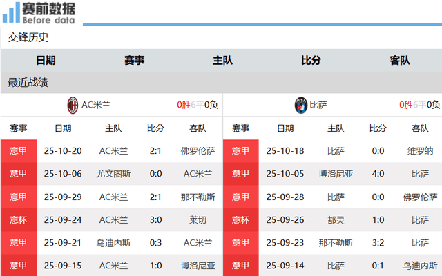 第一:两队情况!意甲7轮战罢,AC米兰5胜1平1负积16分排名第一,领先国际米兰、那不勒斯和罗马均1分;比萨3平4负未尝胜绩,积3分排名垫底。上轮意甲,AC米兰主场2-1逆转击败佛罗伦萨,豪取主场四连胜,莱奥梅开二度;比萨主场0-0战平维罗纳,联赛7轮不胜。