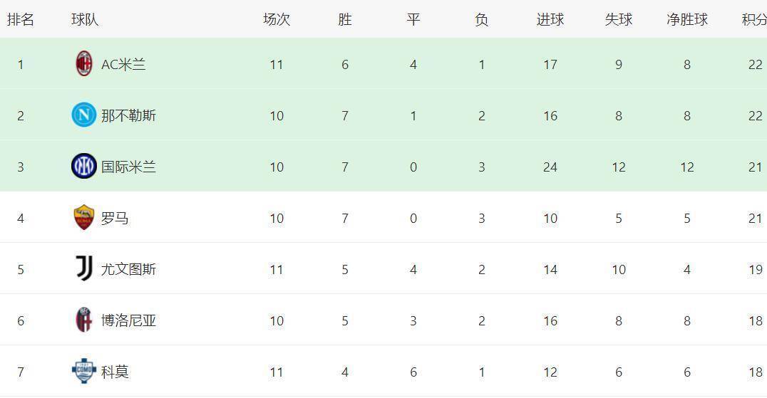 这一连串的平局,像是一只无形的手,瞬间搅动了意甲的积分榜。 AC米兰与那不勒斯同积22分,米兰凭借进球数优势登上榜首。国际米兰和罗马同积21分,紧追其后。 而尤文图斯,则以19分暂列第五。