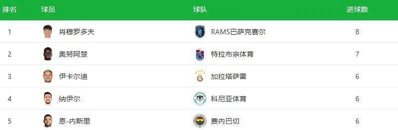 目前领跑土超射手榜的球员是乌兹别克斯坦前锋肖穆罗多夫,他在RAMS巴萨克赛尔队已经攻入8球。紧随其后的是前意甲金靴、昔日国际米兰队长伊卡尔迪,虽然他目前排名第三,但凭借他的进球效率和对土超的了解,重新夺得榜首只是时间问题。