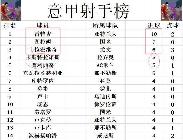 射手榜方面,雷特吉10球领跑,图拉姆7球位列第2,韦拉霍维奇6球排在第3。卡斯特拉诺斯今天梅开二度后,追上普利西奇,克瓦拉茨赫利亚,三人5球并列第4。卢卡库,劳塔罗,莫塔,库特罗内等人则是4球刚好挤入前十。返回搜狐,查看更多