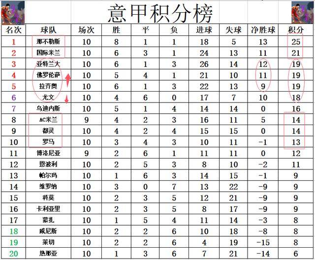 积分榜方面,10轮战罢,那不勒斯还是以4分优势力压国米领跑,佛罗伦萨,拉齐奥今天齐赢球,都追上了亚特兰大,分列3到5位。尤文虽然是目前唯一保持不败的球队,但是平了6场的他们被佛罗伦萨,拉齐奥,亚特兰大挤到了第6的位置。罗马赢球后也远离了降级区,落后AC米兰1分排在第10。