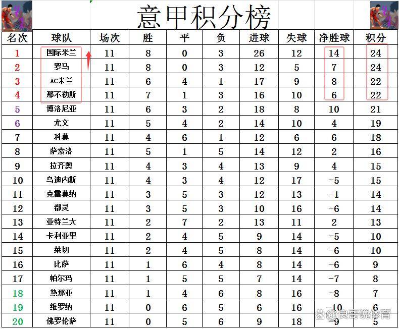 积分榜方面,国际米兰和罗马在本轮双双获胜,积分反超了输球的那不勒斯和战平的AC米兰。国际米兰凭借净胜球优势跃升至榜首,罗马紧随其后排名第二。那不勒斯不仅被国际米兰和罗马超越,还因净胜球劣势被AC米兰反超,跌至第四。