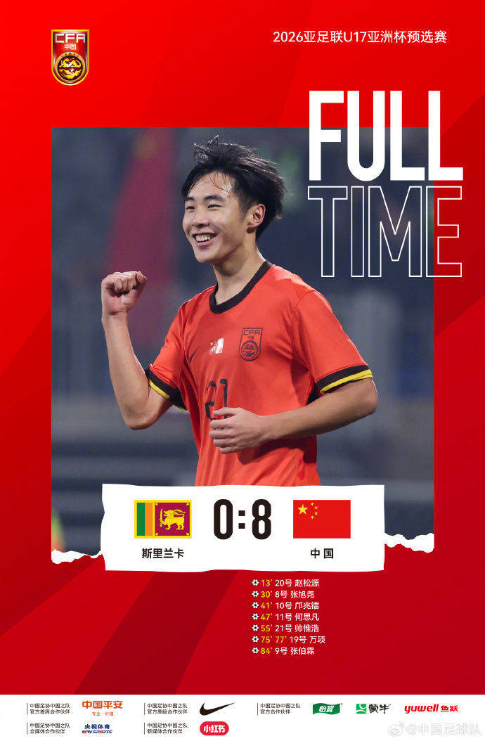 北京时间11月28日,据新华社报道,2026年亚足联U17亚洲杯预选赛在重庆铜梁进行了A组第四轮比赛,中国队8比0大胜斯里兰卡队。