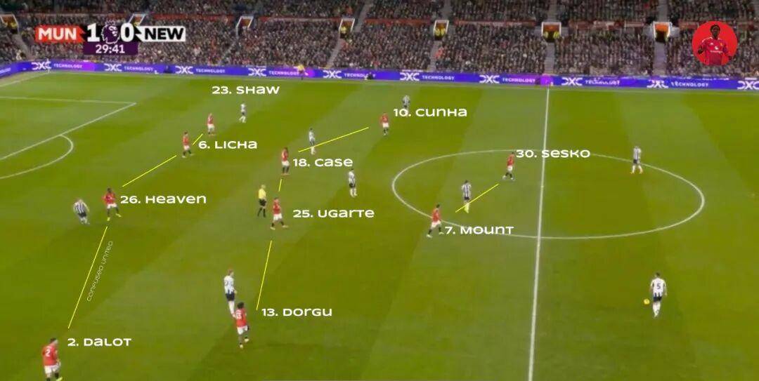 阿莫林此役排出的首发4231阵型着实令人眼前一亮。卢克·肖回归熟悉的左边卫位置,而帕特里克·多古则被委以重任,重现其在意甲莱切效力时担任右边锋的一幕,与迪奥古·达洛一同加强右路的防守力度。中场方面,库尼亚和梅森·芒特临危受命,顶替受伤的布鲁诺·费尔南德斯,承担起组织进攻的重任。